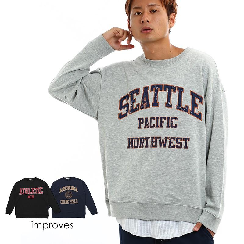 トレーナー メンズ 長袖 カレッジロゴ プリント ドロップショルダー スウェット スエット 裏毛 黒 紺 大きいサイズ Improves インプローブス 通販 Yahoo ショッピング